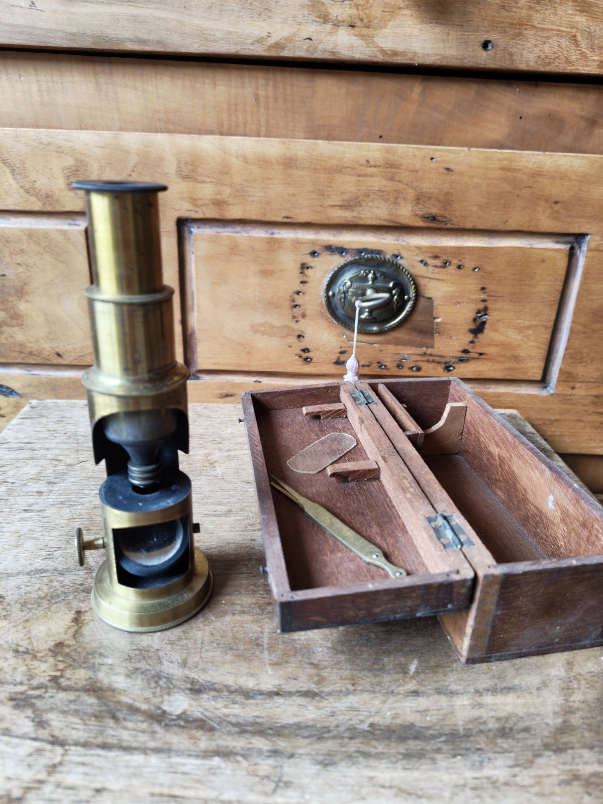 アンティークのフランス製フィールド顕微鏡、箱入り。